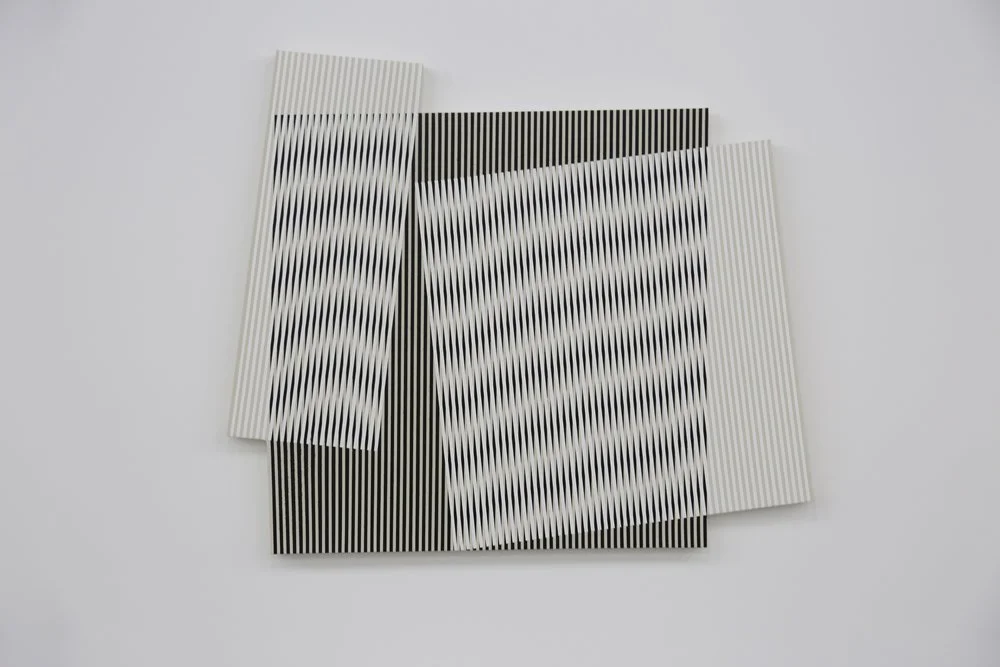 From the earliest IBM computers, which based their punch-card technologies on 19th-century Jacquard looms, through to binary and bytecode weaving, technology and the fibre arts share a richly intertwined history. In Haptic Trajectories, weaving informed the artist’s visual vocabulary as well as his process-oriented practice, but the outcome was decidedly digital. Abraham’s process is a meticulous, accretive one, not dissimilar to the way that code is built up line by line. Tape is used to create repetitive line patterns that are superimposed, rotated, and slightly phased to destabilize and dizzy the viewer’s gaze. In particular, his moiré paintings at once suggest the waviness of watered silks and the render errors that you might get when taking a photograph of a screen, as well as the Java Lake applet that was so ubiquitous in the early days of the internet.