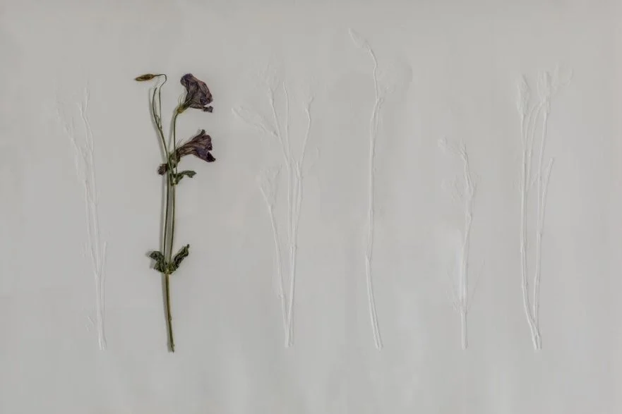 In her Body Impressions series, Safaei uses her own body to make marks on textiles. Unlike the full-body prints of Jasper Johns or David Hammons however, the body is not depicted but only intimated here, with smears and swooshes that might be a shoulder or perhaps a knee; it is unclear. Spidery skeins of dots connect body parts to each other, sometimes trailing off over the page with a tentativeness that directly contrasts with the assertive intensity of these body prints. In Rabieijah’s Spinning Plate series meanwhile, plants are pressed into paper to leave beautiful deboss-like indentations. But unlike pressed and preserved plants, the botanic matter is removed and discarded, leaving only the void behind, like a trail of perfume after someone who has forever walked away.
