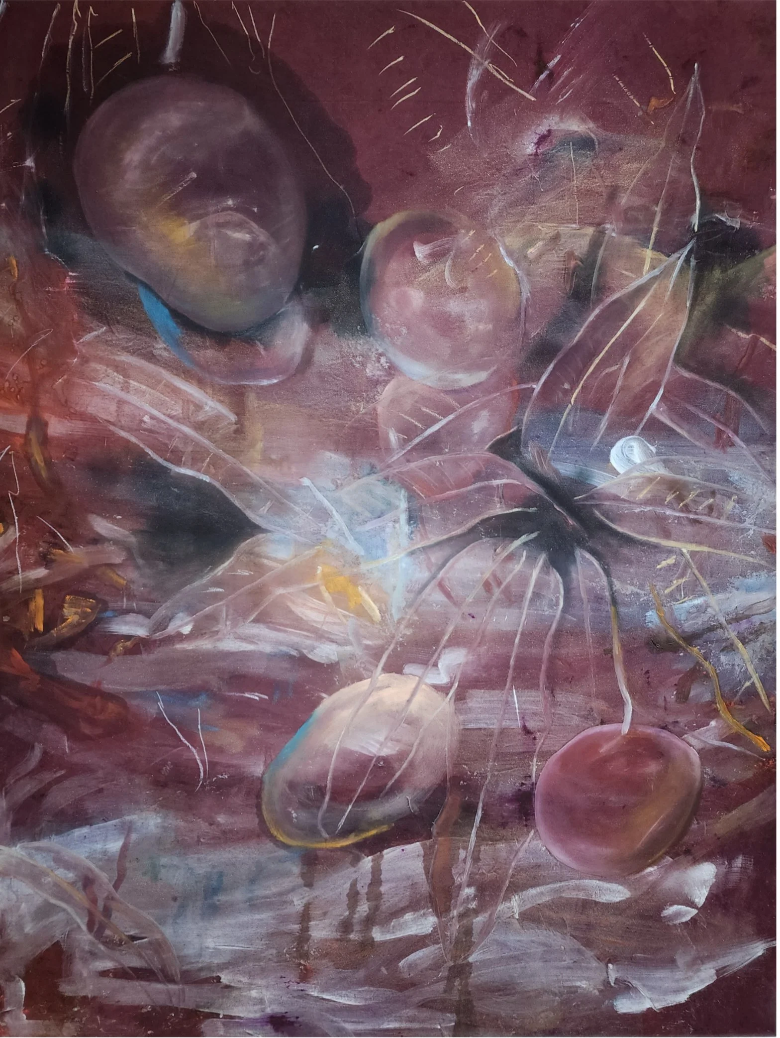 Hashel Al Lamki’s painting ‘Under The Mango Tree’ beautifully depicts ripe mangos, patiently waiting to be harvested. This artwork serves as a heartfelt tribute to the artist’s grandfather, who resided on his farm in the Mtawpa, Republic of Kenya. As a child, Al Lamki’s grandfather became his initial introduction to an alternative way of life, ‘living off the grid’ – embracing the land, cultivating crops, and raising livestock to sustain himself. The materials employed in the creation of this artwork are natural pigments sourced from the region. As an adult, he takes on the responsibility of reviewing his art-making process, with a focus on minimizing his carbon footprint and maintaining a vigilant watch on its environmental impact. Aligned with the overarching theme of the show, this commitment underscores the importance of being environmentally conscious.