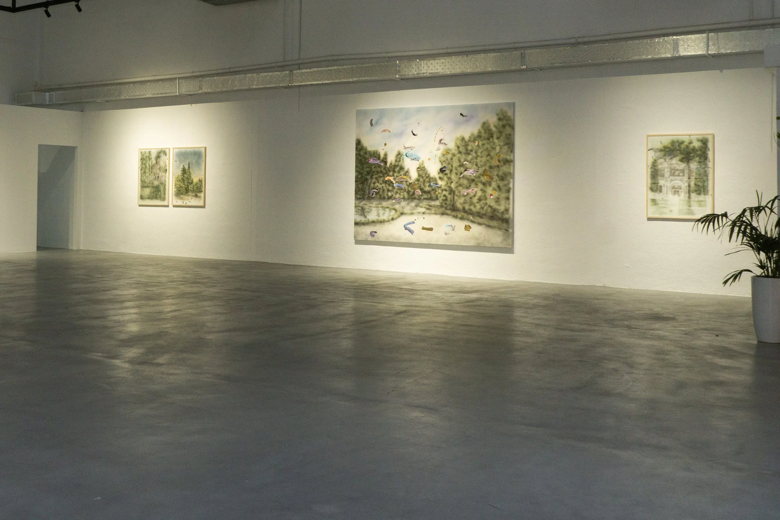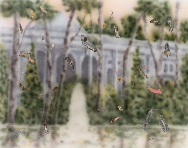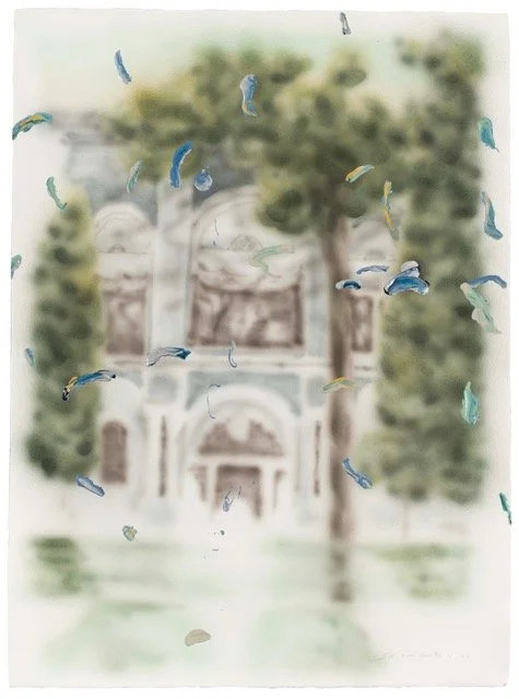 Tehran-based artist Salé Sharifi works primarily with painting and notions of visibility, history and memory. His works eschew traditional portraiture and instead zoom in on the lush backdrops which featured Qajar monuments. Although he references Qajar miniature painting, his works comment on a certain hybridity through Occidental influences that occurred after that time during the Safavid era. Drawing from Persian gardens, his paintings have evolved from precise depictions of flowers, plants and fountains into abstract, almost three-dimensional perspectives, as if behind translucent glass. The airbrushed gardens he depicts — Golestan, Hafezieh, Negarestan — index real places tinged with nostalgia, like a fading remembrance. As these images recede from vision, Sharifi adds thick curly marks to the surface of his paintings to remind the viewer that art is illusion and artifice. Just as a garden is landscaped and moulded, at times with flowers and trees imported from Europe, so too is the artist’s tool and medium.